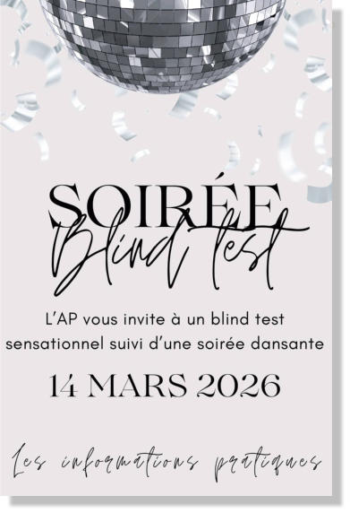 Quelques dates…•Classes de Neige : du 7 au 14 février•Congé de Carnaval : du lundi 16 février 2026 au vendredi 27 février 2026•Blind Test de l’AP : 14 mars•Fancy-Fair : samedi 30 mai